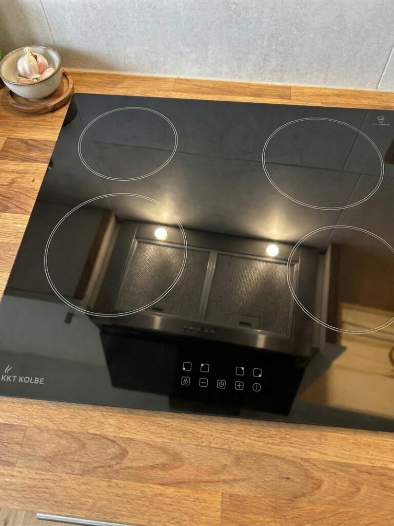 Im ersten Schritt des Praxistests wurde das Kochfeld eingebaut und angeschlossen. Mit einer Breite von 59 cm passt das Gerät in gängige Standardausschnitte und ließ sich entsprechend problemlos in die Küchenarbeitsplatte einsetzen. Das Kochfeld ist autark, wodurch keine Verbindung zu einem Backofen erforderlich ist. Der elektrische Anschluss wurde fachgerecht durch einen Elektriker durchgeführt, wobei die Inbetriebnahme ohne Komplikationen erfolgte.