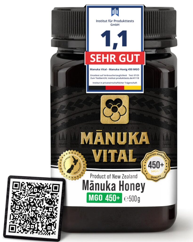 Die Manuka Honig (450+ MGO) von Manuka Vital hat unseren Test nach IFP-Verfahren im deutschen (IFP) Institut für Produkttests mit der Gesamtnote 1,1 bestanden. Der Test wurde im Juli 2025 durchgeführt und erhielt die Lizenznummer 41118.