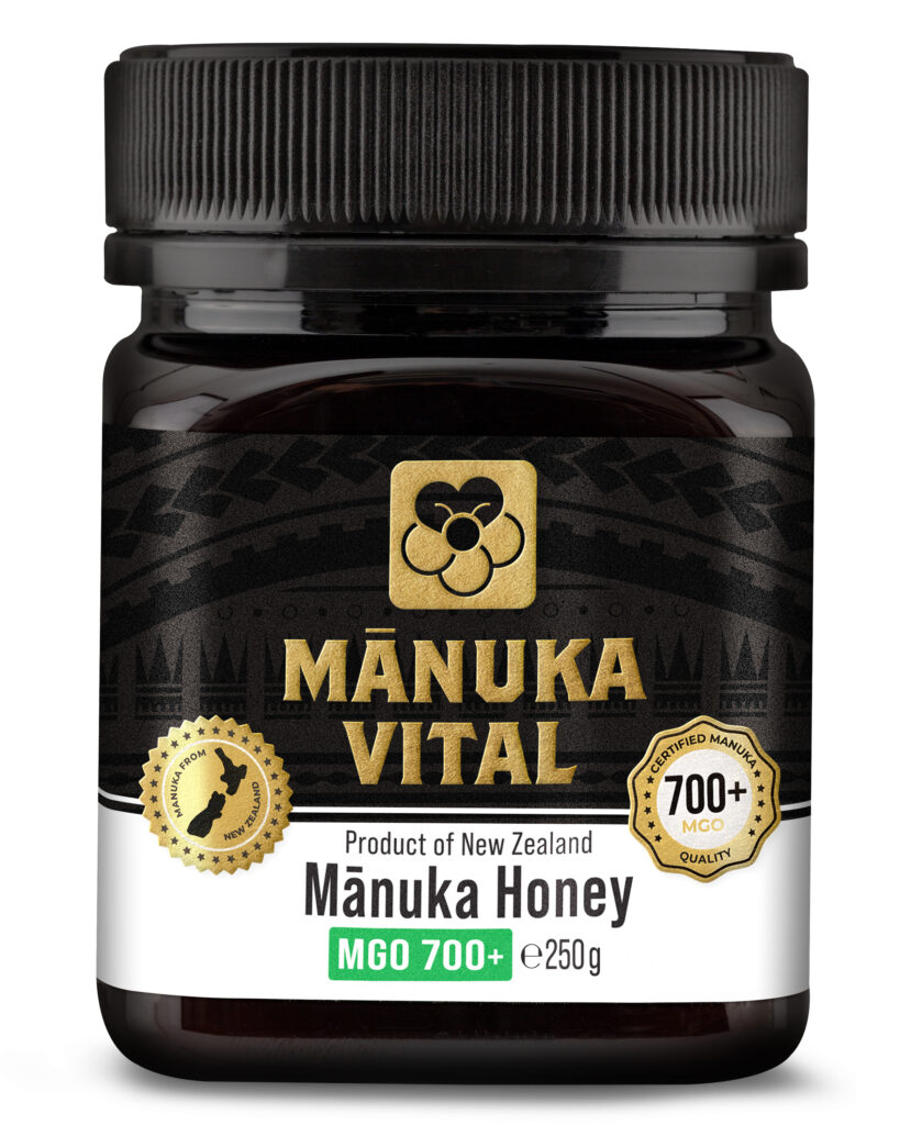 Auch das Design der Verpackung macht einen hochwertigen Eindruck. Die dunkle Farbgebung ist nicht nur elegant, sondern erfüllt auch einen funktionalen Zweck: Manuka Honig wird in lichtgeschützten Behältern – hier einem stabilen Kunststoffgefäß – verpackt, um die lichtempfindlichen, antibakteriellen Wirkstoffe, insbesondere den wertvollen MGO-Gehalt, bestmöglich zu schützen. Das Etikett ist modern gestaltet. Auf der Vorderseite sticht sofort der MGO-Wert (Methylglyoxal) ins Auge, hier mit MGO 700+.