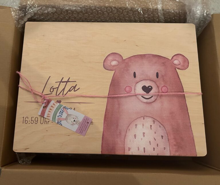 Bereits beim ersten Auspacken überzeugte uns die Erinnerungskiste durch ihre warme Holzfarbe und das liebevoll gestaltete Design. Für den Test wählten wir das Bärenmotiv, das zusammen mit Namen, Geburtsdatum, Uhrzeit, Gewicht und Größe des Kindes individuell auf den Deckel graviert wurde. Die Gravur wirkte hochwertig und präzise. Das schlichte, naturbelassene Kiefernholz fügte sich zudem harmonisch in verschiedene Wohnstile ein und vermittelte einen wertigen Gesamteindruck.
